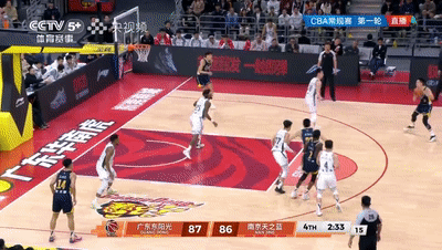 第四节直到7分20秒广东队才由奎因突破拿下本节第一分,由于三分球迟迟未开,导致广东队仍然处于落后,杜锋无奈换上萨林杰,5分35秒郭昊文再持球强杀拿到2分,同曦领先来到3分。